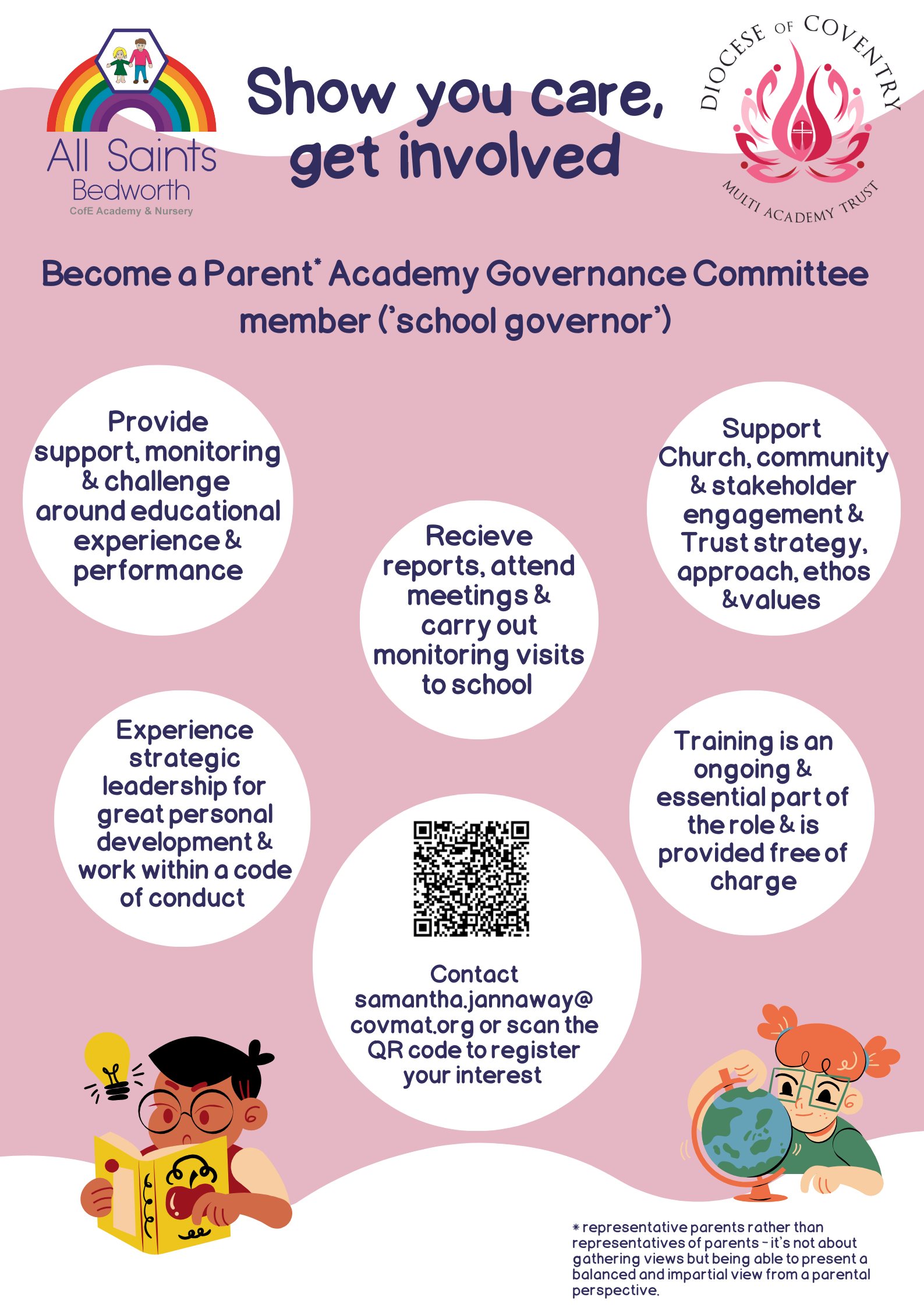 The school is part of the Diocese of Coventry Multi Academy Trust and the Academy Governance Committee (AGC) is part of the governance structure of the Trust which is responsible for overseeing strategic decisions of the school. The governance structure for the trust as a whole is outlined in the governance structure documents here.
